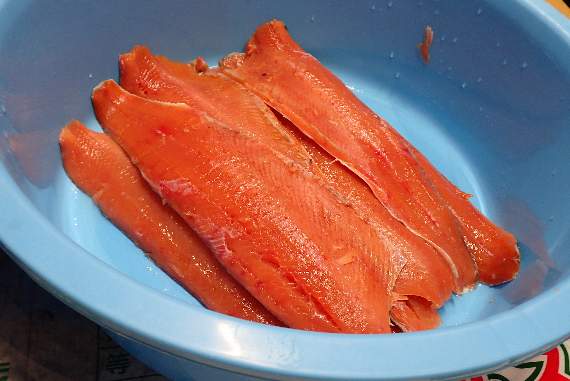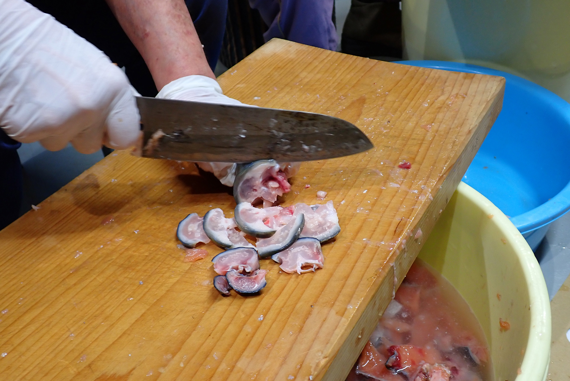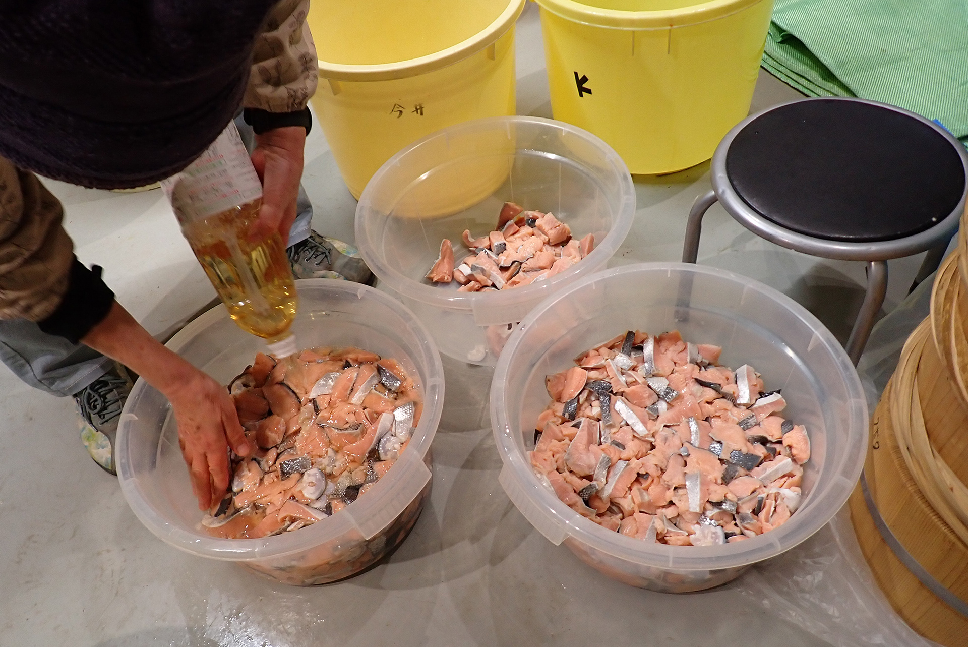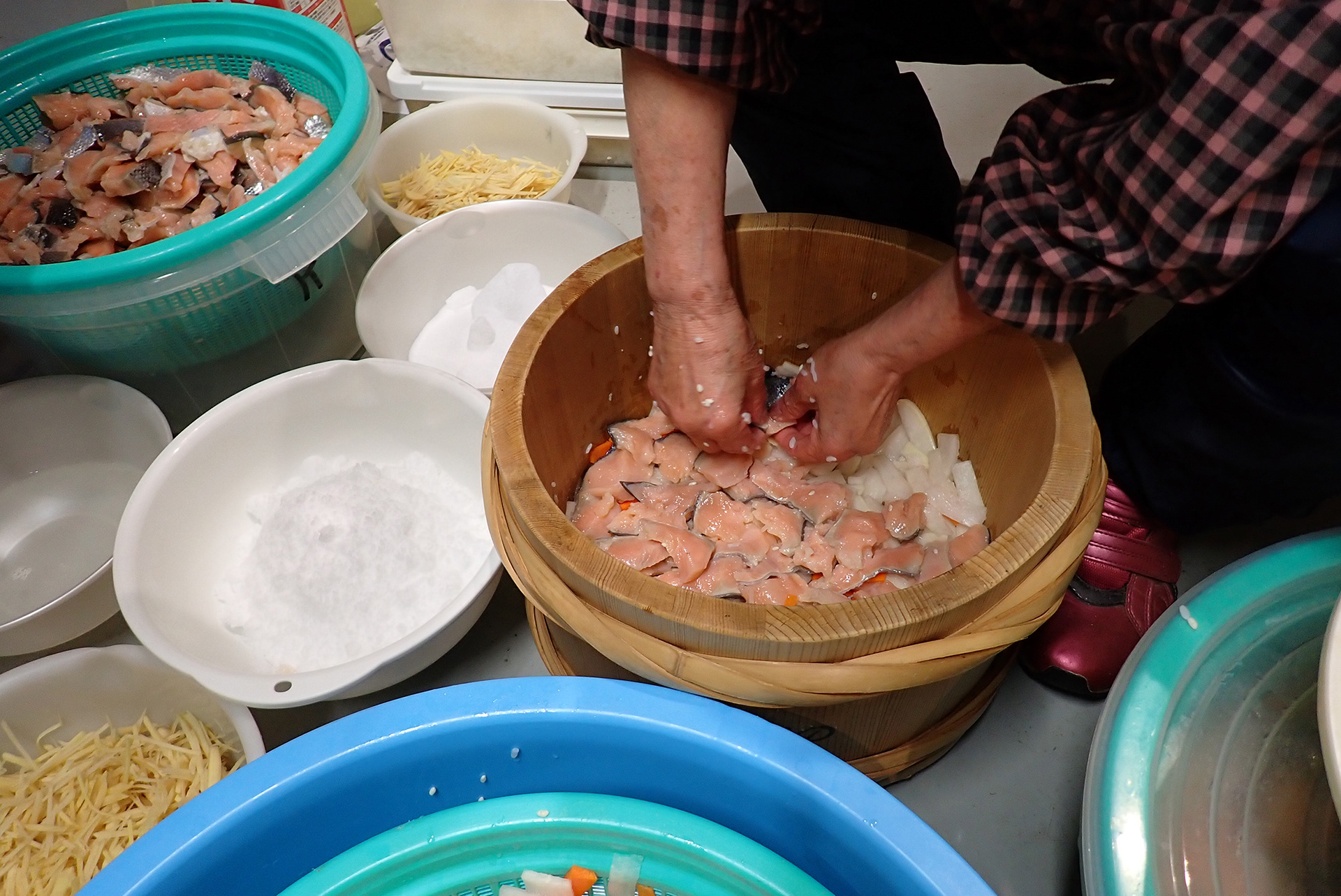 この日の作業は、鮭を一口大に切って水に浸けるところまで。漬け込む前夜に酢漬けにするまで、朝晩水を替えつつかき混ぜて、汚れやうろこを落とすのだそうです。