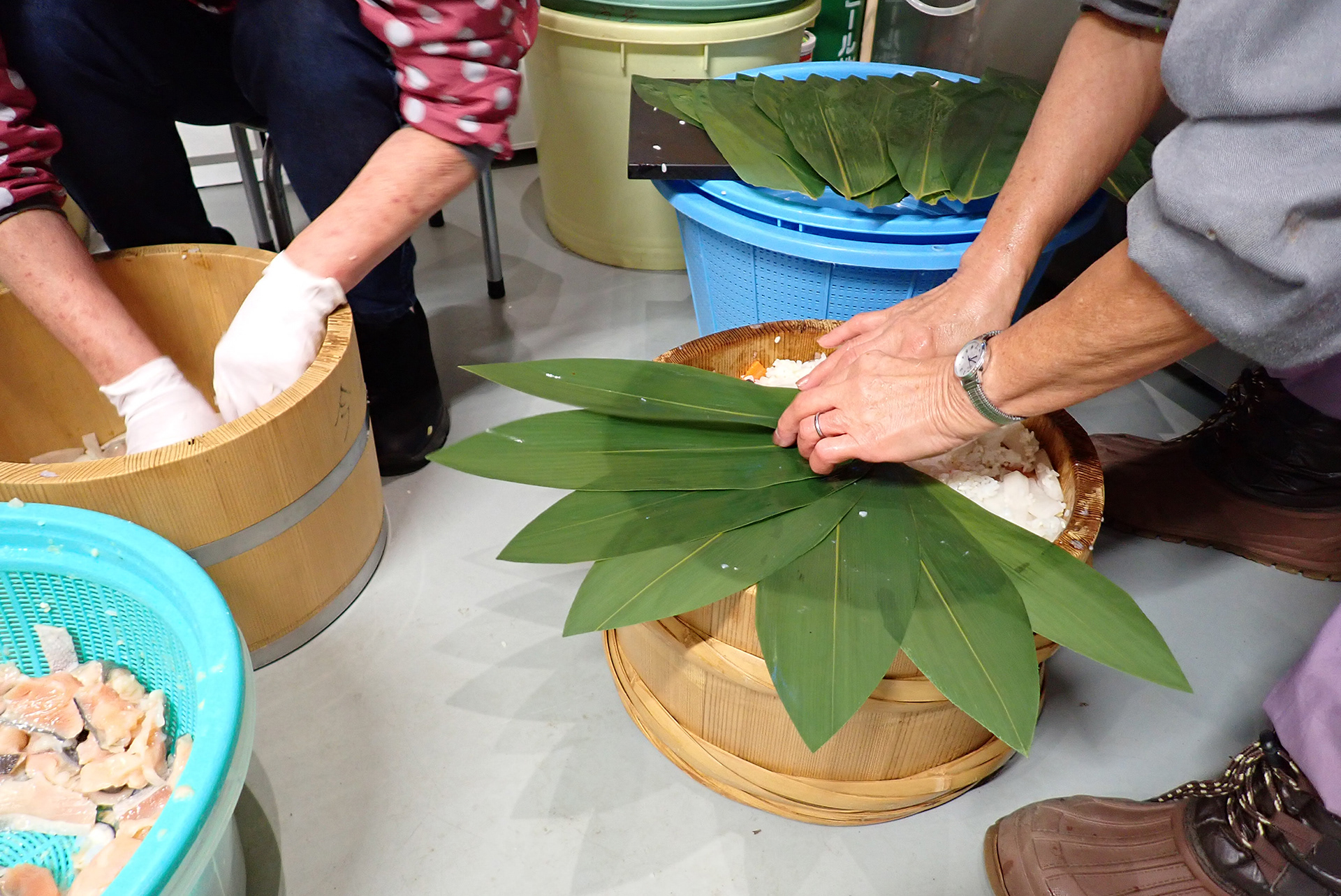 材料を重ねて樽をいっぱいにしたら、最後に笹の葉をのせます。今ではスーパーで買った笹の葉を使っていますが、昔は自分で取りに行っていたそうです。この笹の葉の殺菌効果が飯寿司の保存性をより高めてくれます。