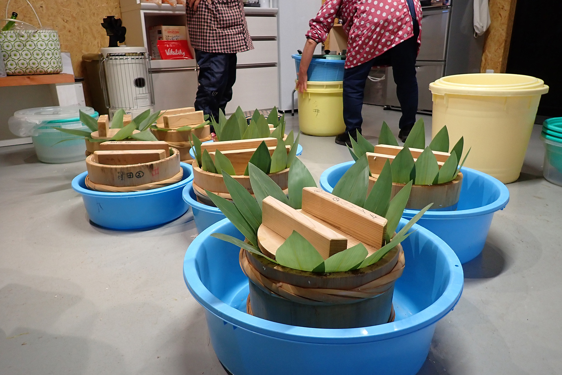笹の葉の上から蓋をそっとのせ、木樽はプラスチックの桶に入れておきます。こうすることで出てきた水分がふたたび木樽を通して吸われ、味がよく染み込んでおいしくなるといいます。このプラスチックの桶ごと各家庭に持ち帰り、蓋の上におもしをのせてそれぞれ管理します。