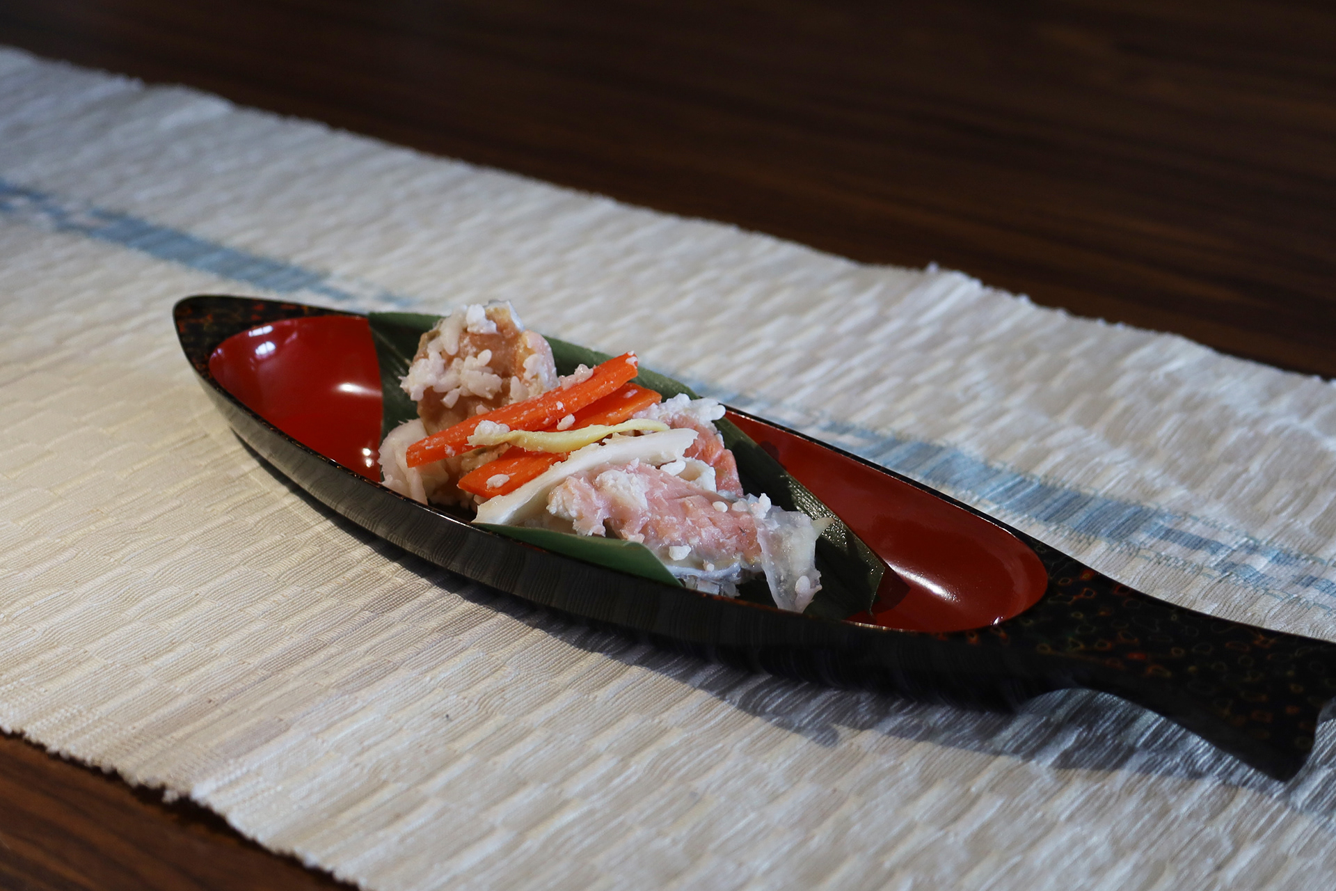 友好都市である弘前市の伝統漆器津軽塗りにそっと盛られた鮭の飯寿司は美しく、目にも味わい深いものでした。「実家の飯寿司よりおいしい」なんて声も聞こえるほど。