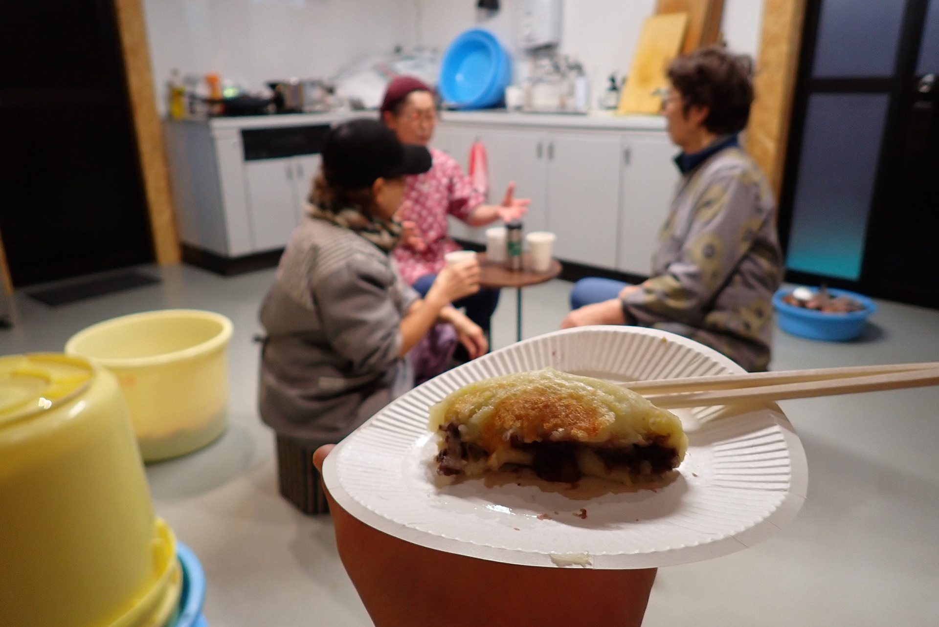 実際に飯寿司づくりのお手伝いをさせていただいて感じたのは「とにかく楽しそう」。手を動かしながら、最近の話をしたり、テレビの相撲をみて熱が入ったり。和気藹々とした雰囲気のなかでも役割分担がしっかりできていてテキパキ作業を進めながら片付けまで済ませてしまう手際の良さは舌を巻くほどでした。その日の作業が終わると「いももちをつくってきたから焼いて食べよう」「私はお茶を用意したよ」と、一服の準備すらもあっという間に整うチームワークもさすがでした。