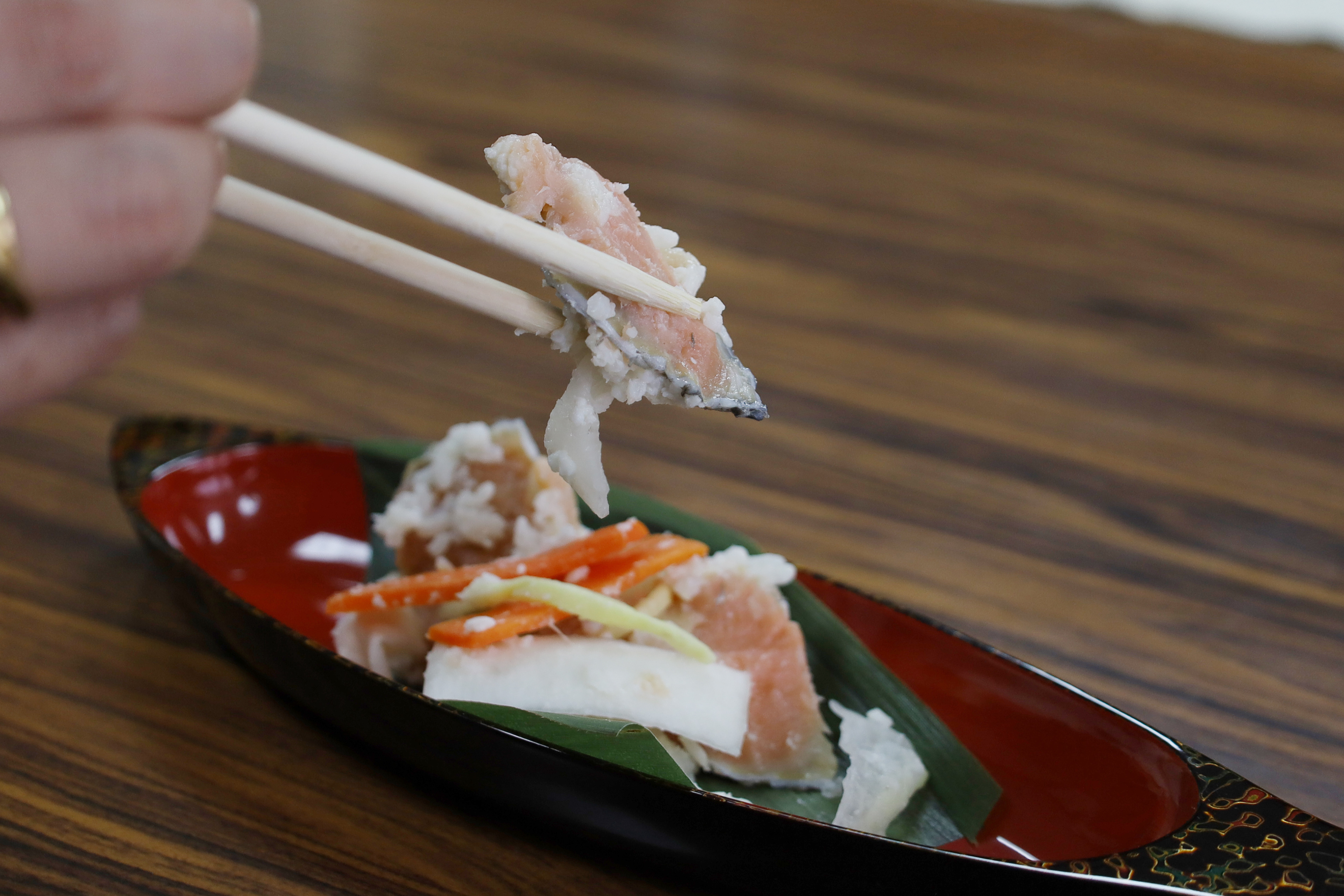 「そろそろ食べごろだろうか」と思っていた12月26日、完成した鮭の飯寿司を届けていただきました。今井さんのご厚意で用意していただいた魚の形をした津軽塗りの器によそって、いざ実食。