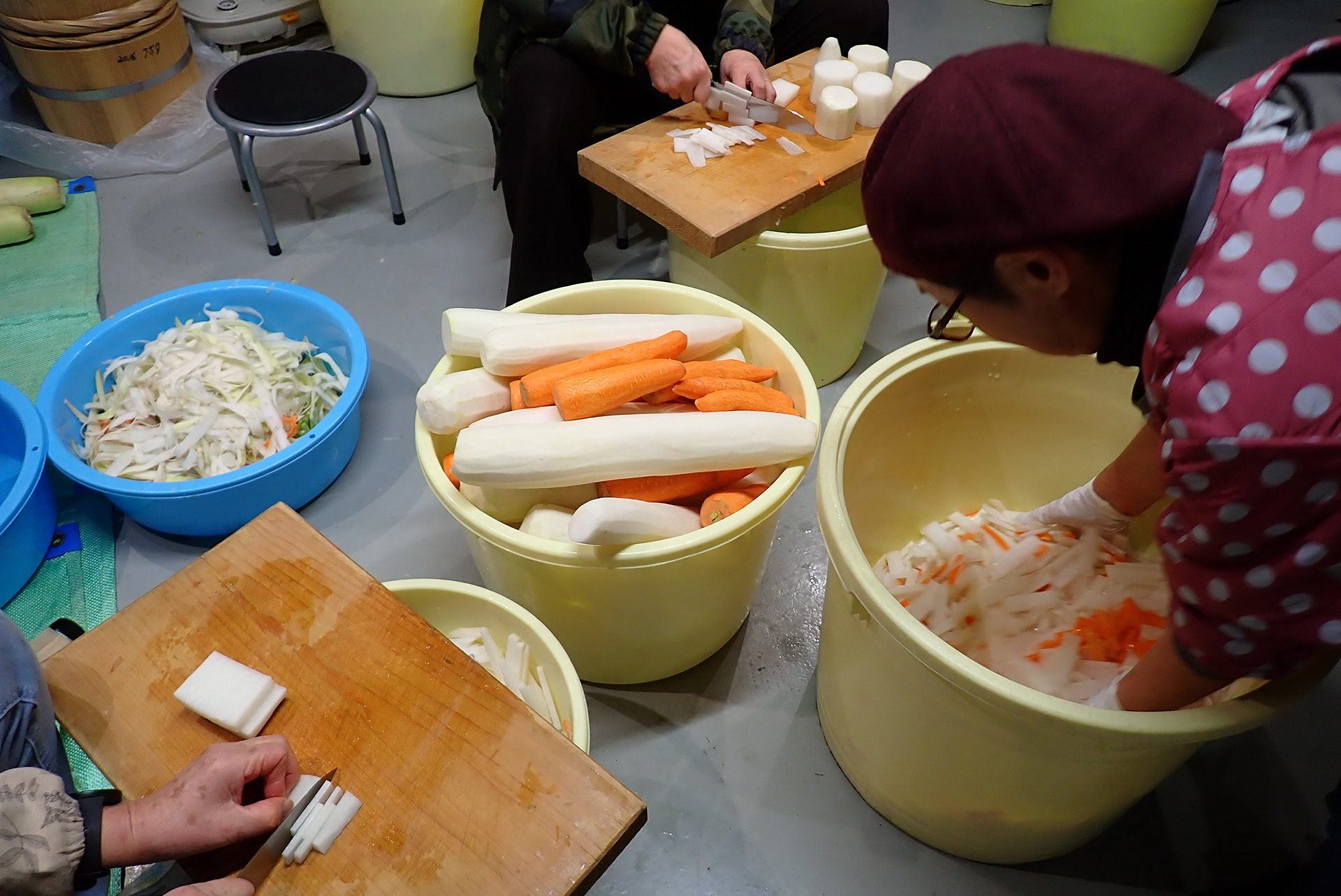 「日本の郷土料理らしい考え方だな」と考えながら作業に没頭すること数時間。切った野菜は色のバランスをみながらバケツに移し、塩を揉み込み下味をつけます。